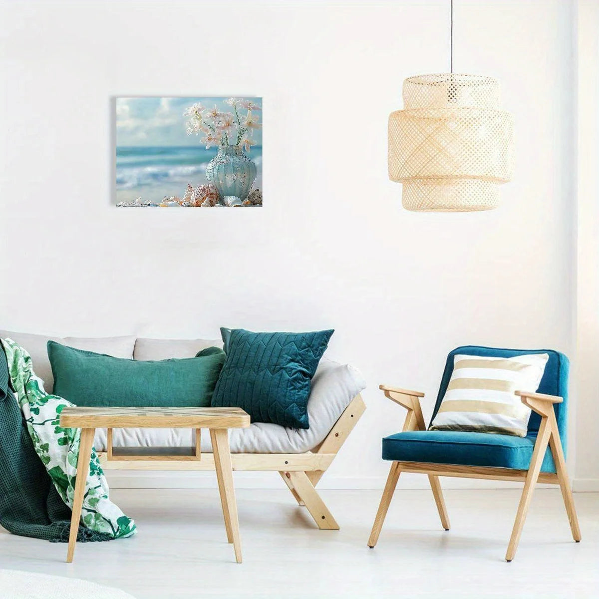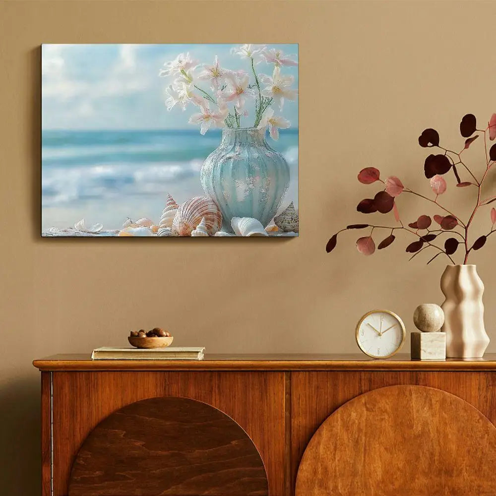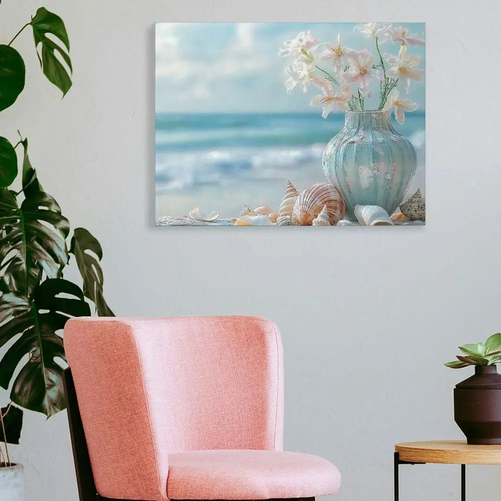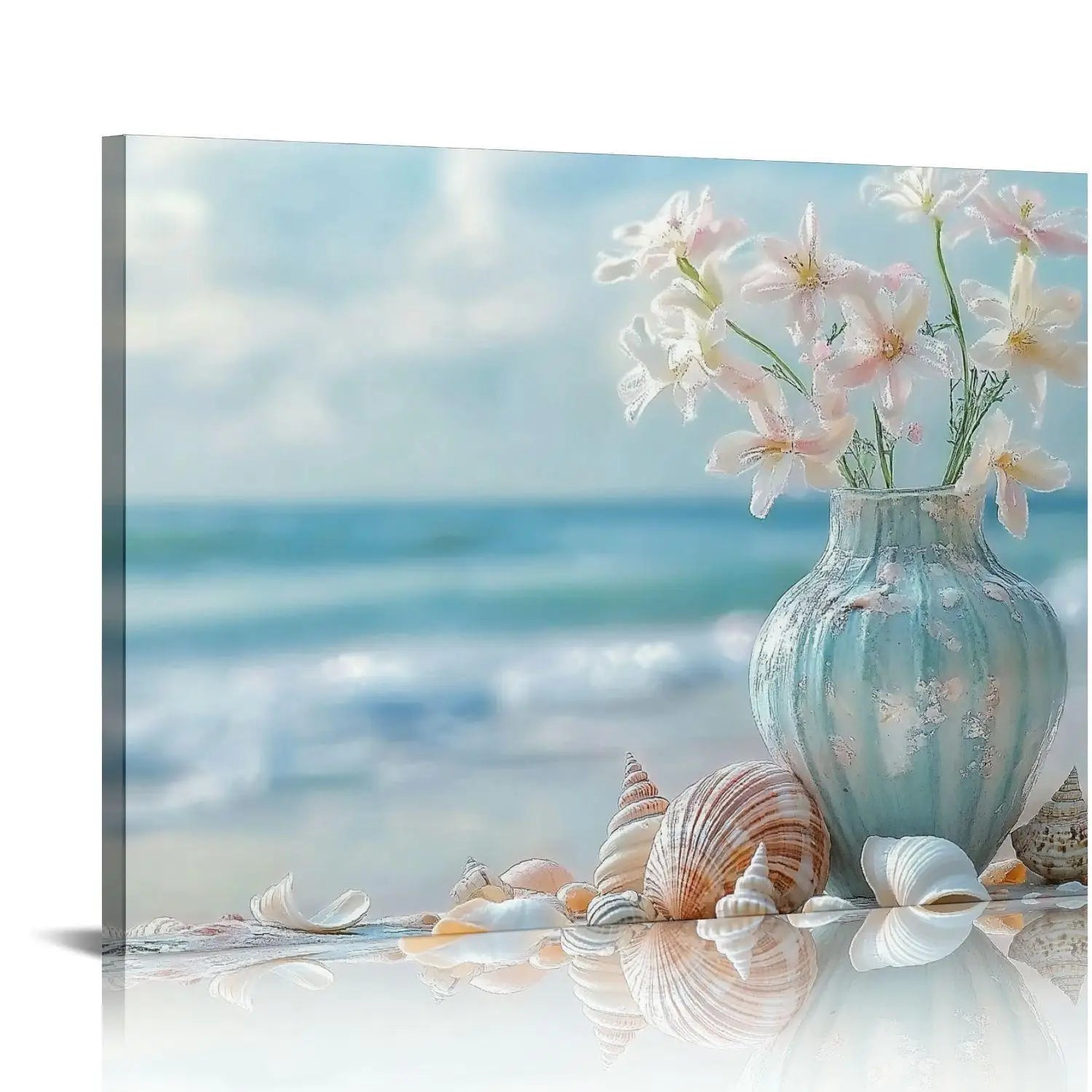 Canvas Beach Scene with Flowers Starfish and Seashells