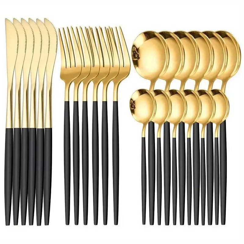 Elevate your dining experience with our 24-piece silverware sets, available in multiple color options. Crafted from durable stainless steel, these sets are perfect for any occasion and include all the necessary pieces for a complete dining experience. With a service for 6, these sets are ideal for both small and large gatherings. The sleek and modern design of these sets will impress your guests and add a touch of elegance to your table setting.