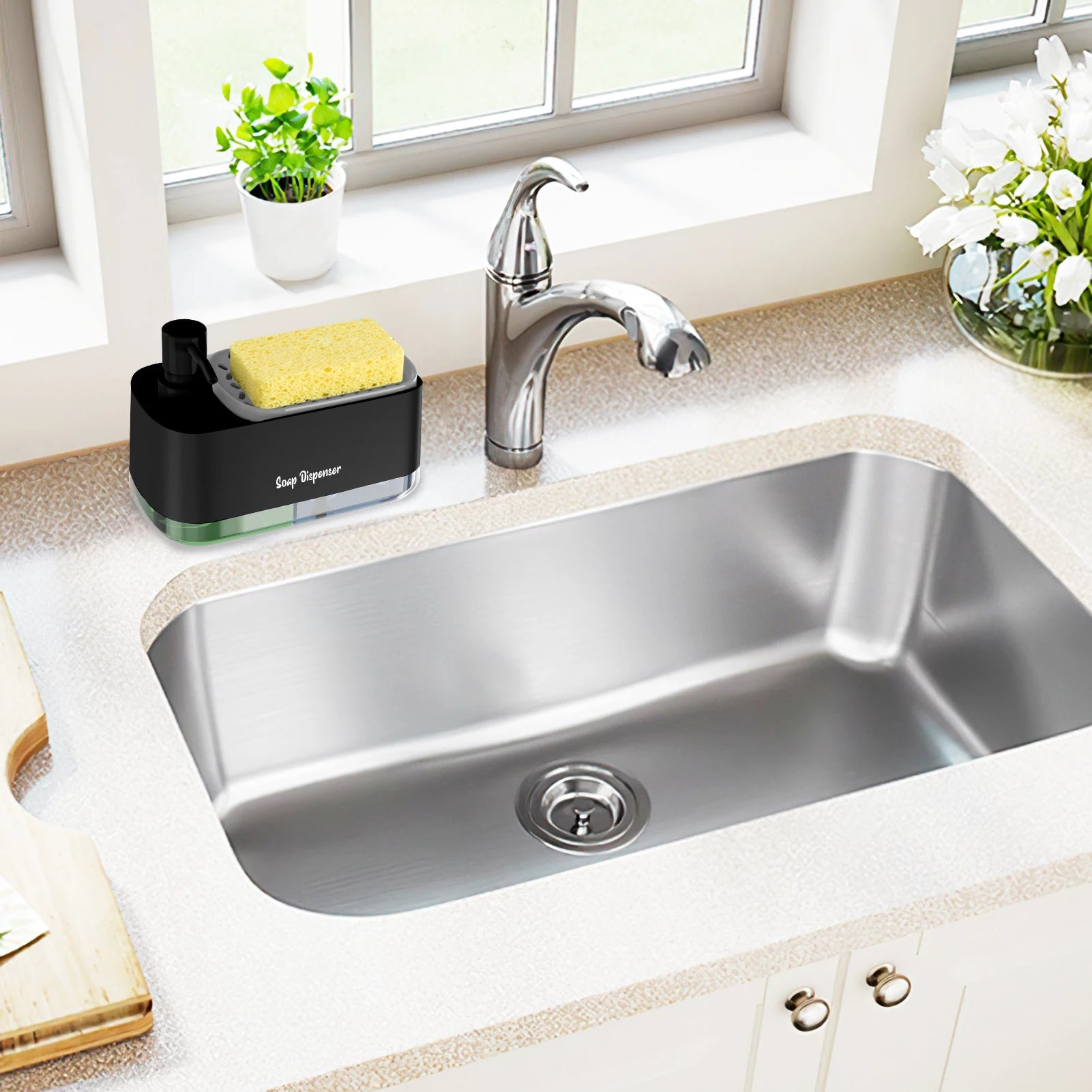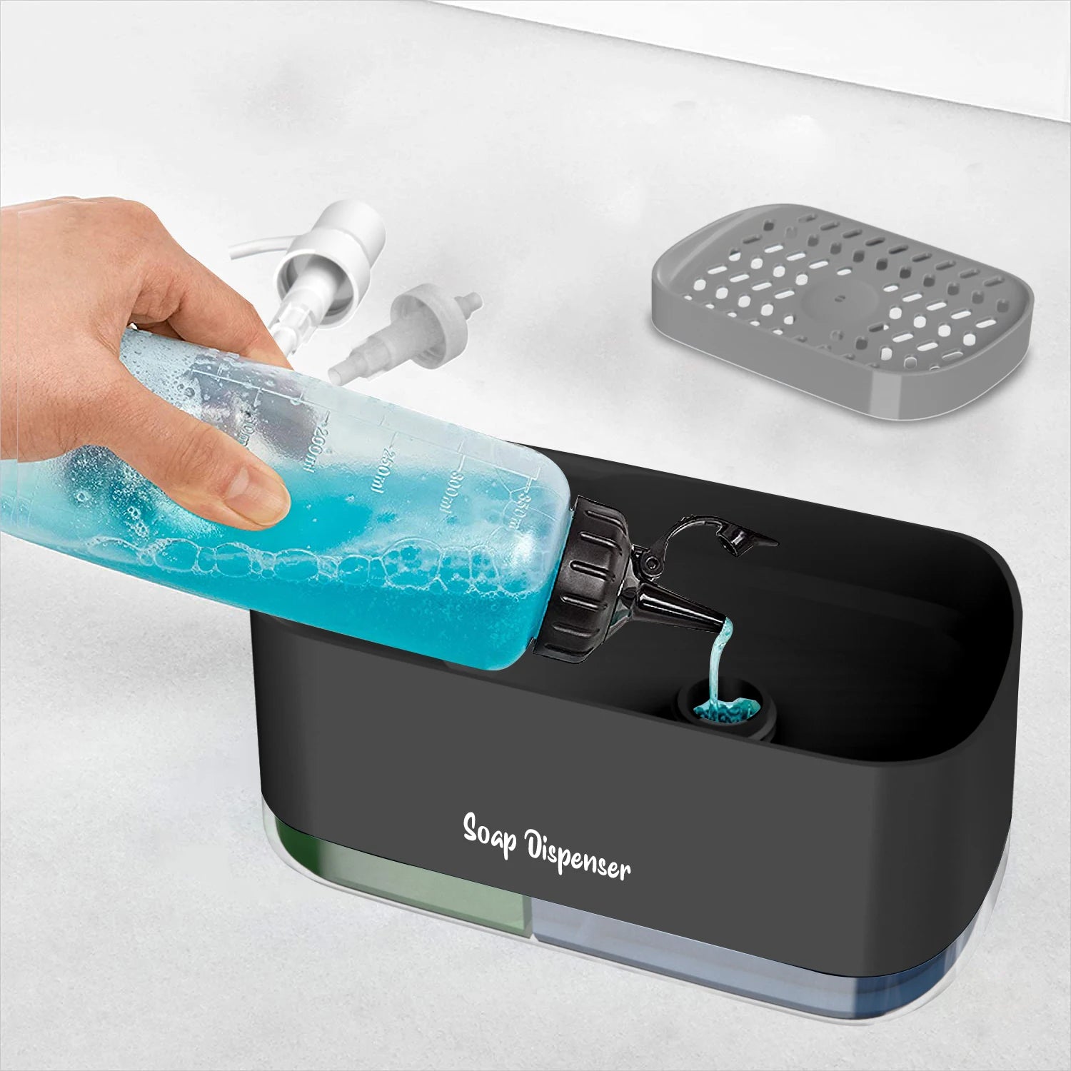 1.Soap dispenser simple structure, easy to disassemble and clean, with a double-layer design for drainage and storage,features a sponge holder on top for easy access.